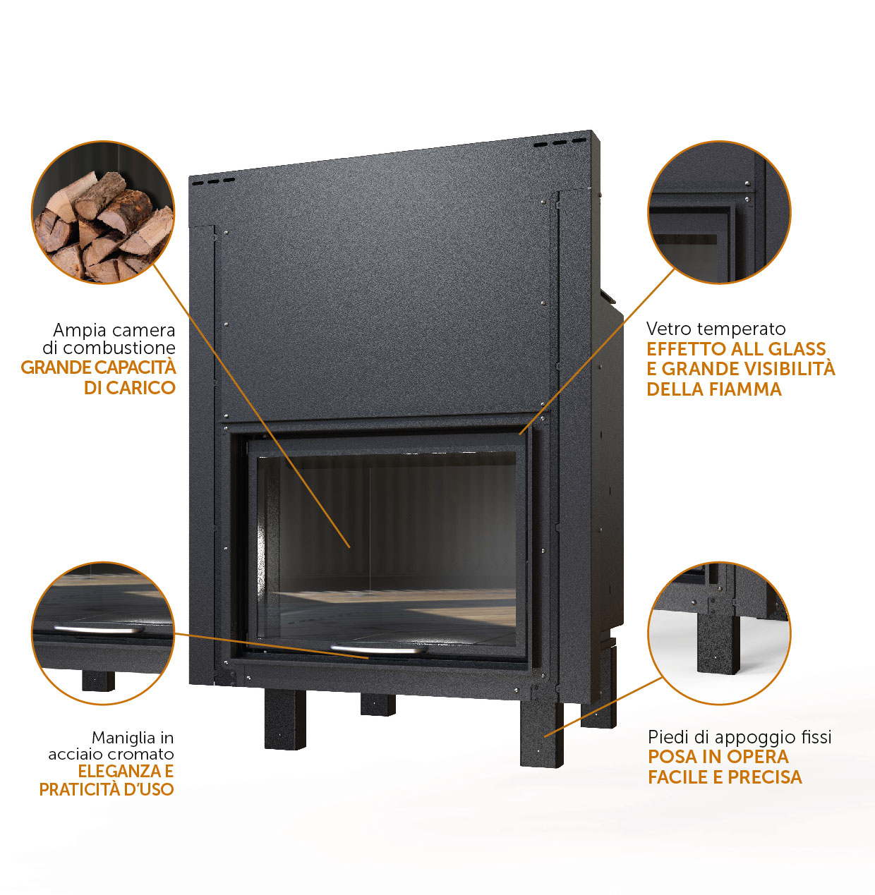 Proposto nella versione con porta piana a scomparsa verticale, con il piano di combustione interamente realizzato in materiale refrattario.
